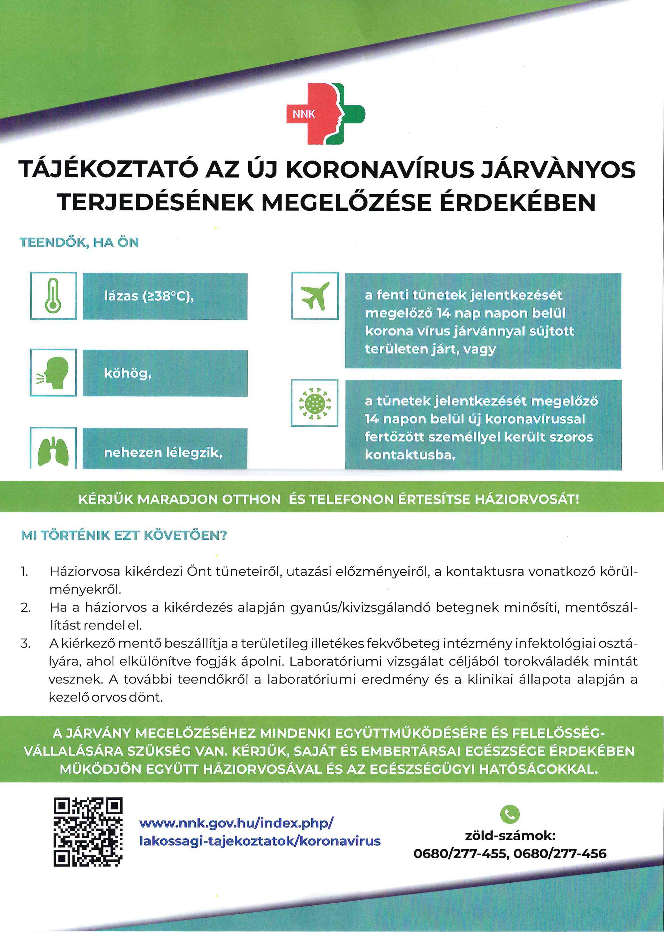 Az alábbiakban közöljük a Nemzeti Népegészségügyi Központ tájékoztató plakátját a koronavírus járványos terjedésének megelőzéséről.